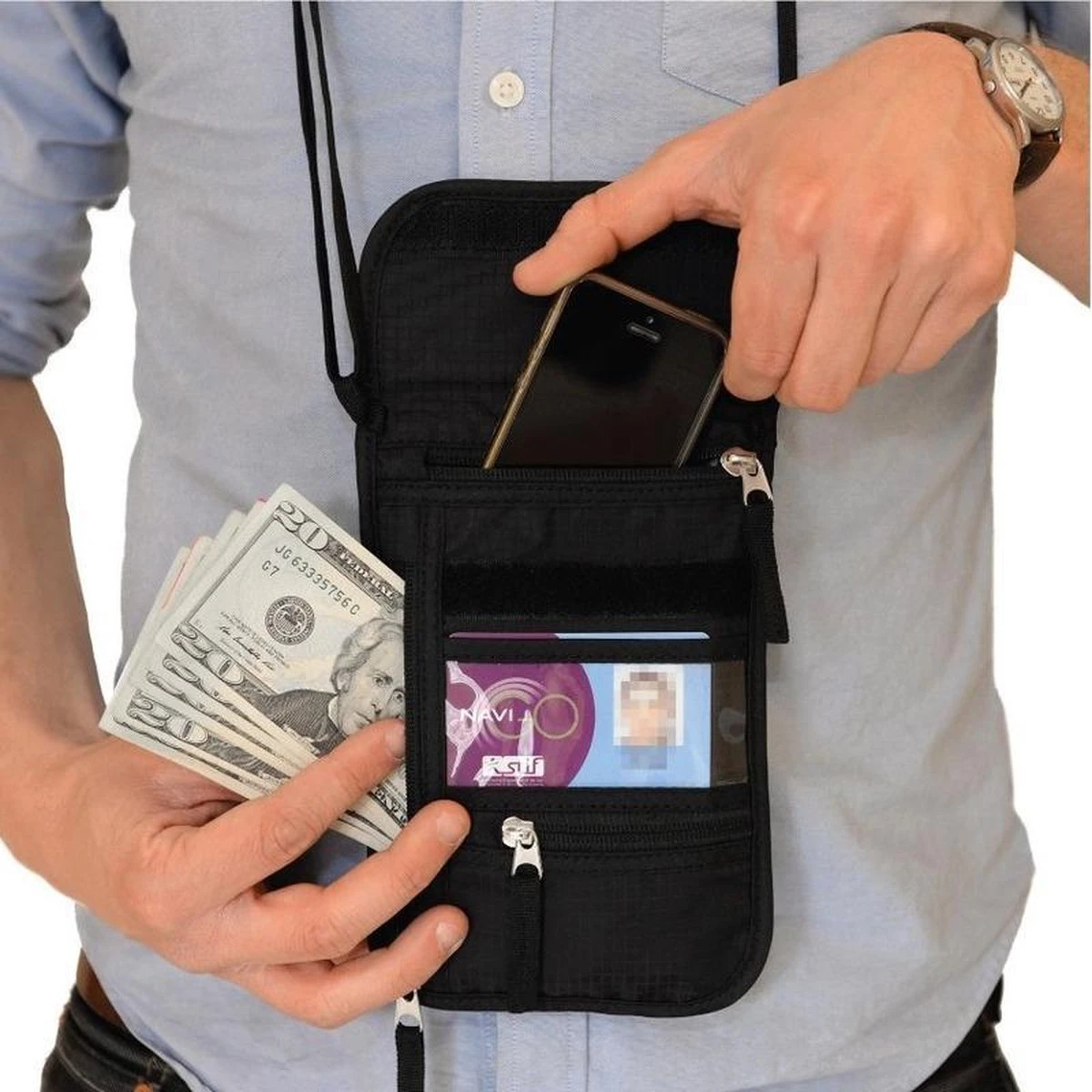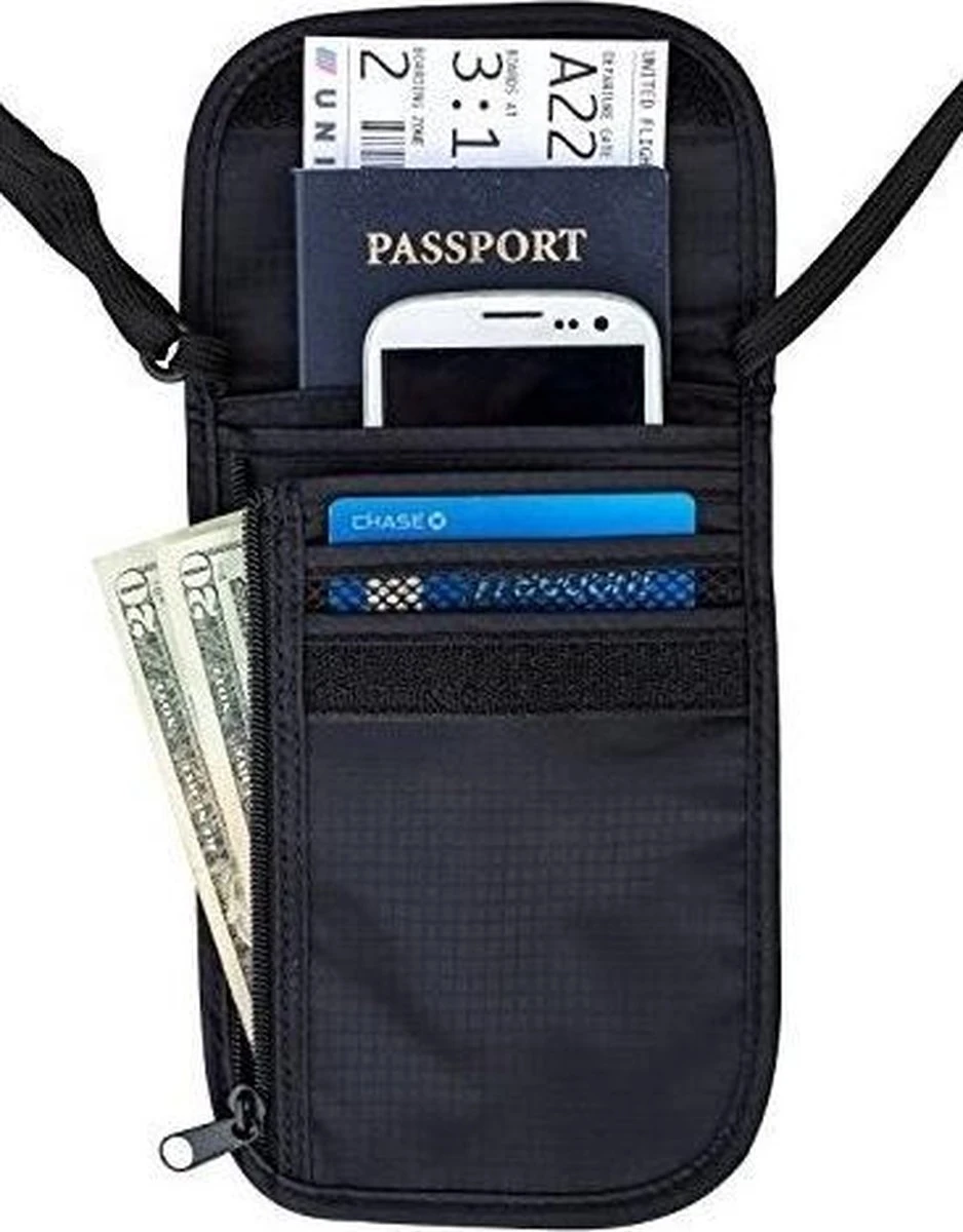 Reisportemonnee/nektasje zwart 14 x 17 cm. Praktisch tasje met nekkoord is voorzien van diverse vakken voor geld, paspoort, creditcards/bankbassen, mobiele telefoon, reisdocumenten en andere zaken. De achterzijde is gemaakt van een zacht materiaal waardoor het niet vervelend is om op de huid te dragen. Het formaat van dit tasje is ongeveer 14 x 17,5 cm. Materiaal: polyester. Kleur: zwart.