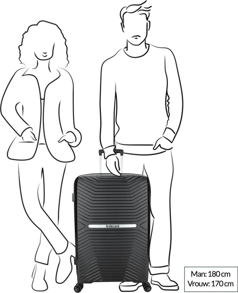 Grote polypropyleen koffer uit de CROSS-ONE serie van het merk Decent. De koffer heeft een rits rondom die op slot te zetten is middels een vast TSA cijferslot. De koffer heeft een tussenschot met rits, diverse extra ritsvakjes en is voorzien van spanbanden. Op de bovenkant en op de zijkant zit een handvat. De koffer is voorzien van een dubbel 4-wiel systeem voor optimaal reiscomfort.