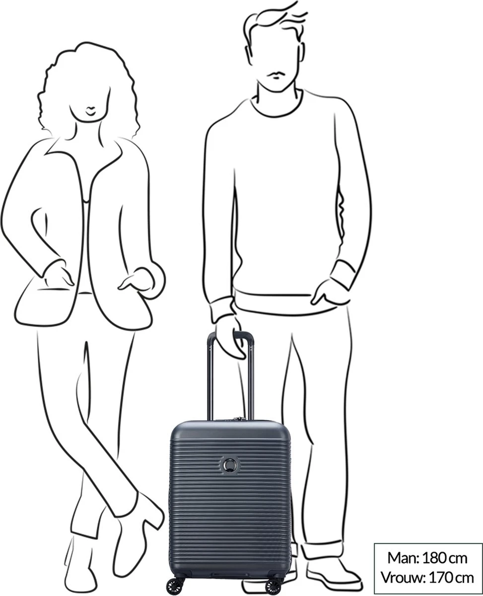 Deze harde koffer van Delsey is geschikt om als handbagage mee te nemen in het vliegtuig. Met een handbagage koffer ten opzichte van een ruimbagage koffer bespaar je tijd en geld. Je hoeft je ruimbagage niet in te checken op de luchthaven en bij aankomst op je bestemming hoef je niet te wachten bij de bagageband om je koffer op te halen. Daarnaast moet je voor ruimbagage ook vaak extra betalen. Als het even kan adviseren wij daarom om een handbagage koffer mee te nemen. Deze Delsey harde koffer is gemaakt van polycarbonaat en ABS. De koffer heeft een buitenafmeting van H 55 x B 40 x D 20 cm en heeft een inhoud van 35 liter. De koffer heeft 4 wielen; koffers met 4 wielen hebben meer stabiliteit en zijn wendbaarder dan koffers met 2 wielen. **Geschikt als handbagage** Deze koffer van Delsey is geschikt als handbagage. Voor een korte reis de meest geschikte koffer omdat voor een ruimbagage koffer extra betaald dient te worden. Citytrip, werkbezoek of een korte vakantie van enkele dagen? Dan adviseren wij een handbagage koffer. Deze koffer van Delsey heeft een inhoud van 35 liter.**Een harde koffer biedt maximale bescherming** Ga je vliegen? Ons advies is dan om te kiezen voor een harde koffer. Wanneer je met het vliegtuig reist heb je zelf niet altijd invloed hoe er met je koffer wordt omgegaan. Ben je zuinig op je bagage dan is een harde koffer wel een must. De koffers zijn stevig en je (waardevolle) spullen zijn goed beschermd. Daarnaast is een harde koffer ook beter bestand tegen regen en vocht dan een zachte koffer.**Geen schade aan je bagage door het TSA slot** Als je koffer door de douane of security wordt opengemaakt, wil je natuurlijk geen schade aan je koffer. Met een TSA slot voorkom je dit, omdat deze met een loper wordt opengemaakt. Bij een ander type slot bestaat de kans dat het slot open wordt gebroken. In Amerika is een TSA slot op je koffer zelfs verplicht.**Inpakriemen & interne verdeler** Deze koffer is voorzien van inpakriemen, zodat al je spullen goed op z’n plaats blijven zitten en het tijdens je reis geen chaos wordt in je koffer. Met de interne verdeler splits je je koffer op in 2 compartimenten met een rits tussenschot.