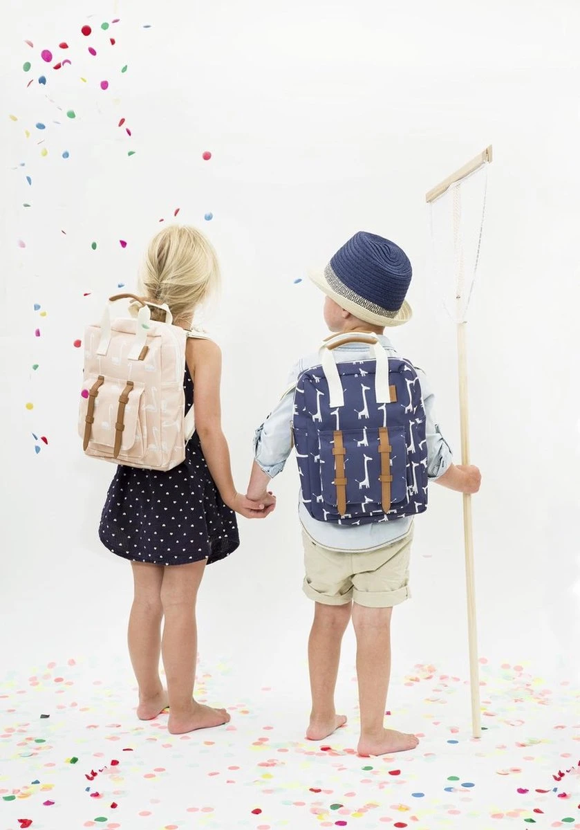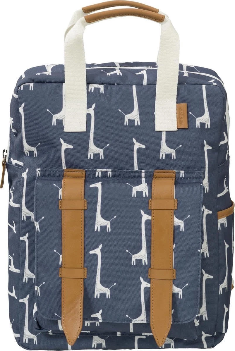 De rugzak is blauw van kleur en heeft een leuke all over print van giraffen.