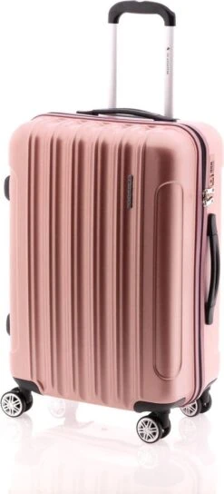 Middelgrote luxe hardschalen, polycarbonaat koffer met dubbele velgwielen en TSA slot. Koffer is voorzien van een ritssluiting rondom. Binnenin gevoerd met bordeaux rode stof en voorzien van tussenschot met ritssluiting, ritsvakje en spanbanden. Koffer is op slot te zetten middels een vast TSA cijferslot op de zijkant van de koffer. Handvat op boven- en zijkant en voorzien van comfortabel 4-wiel systeem. Deze koffer heeft een bijzondere, moderne uitstraling doordat de koffer niet glanzend is maar juist mat/dof.