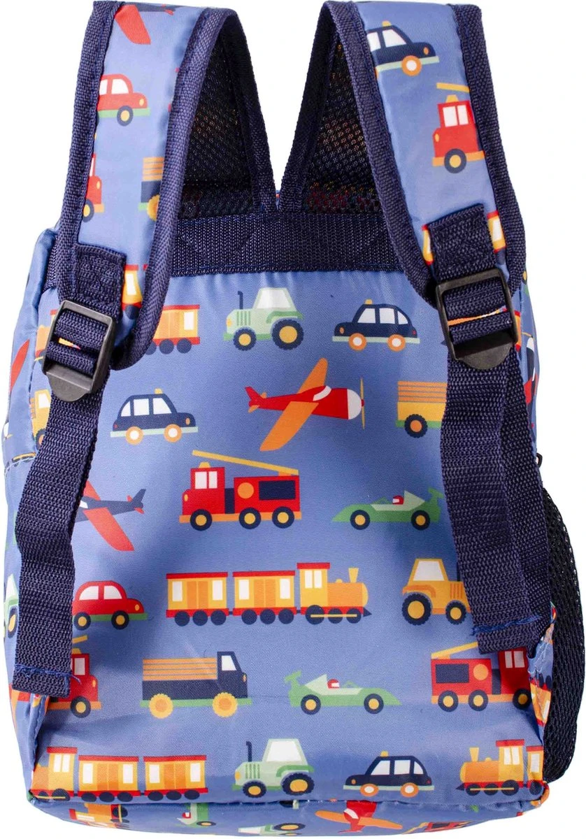 Superleuk blauw rugzak voor de eerste schooljaren vol met toffe vliegtuigen, vrachtwagens en brandweerauto’s!