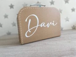 Kinderkoffertje met naam. Afmeting: 25x18x9 cm (lxbxh). Leuk kom cadeau te geven om ter bekend making van jullie zwangerschap of om mee te geven als logeerkoffer. Kleur van de koffer naar keuze.