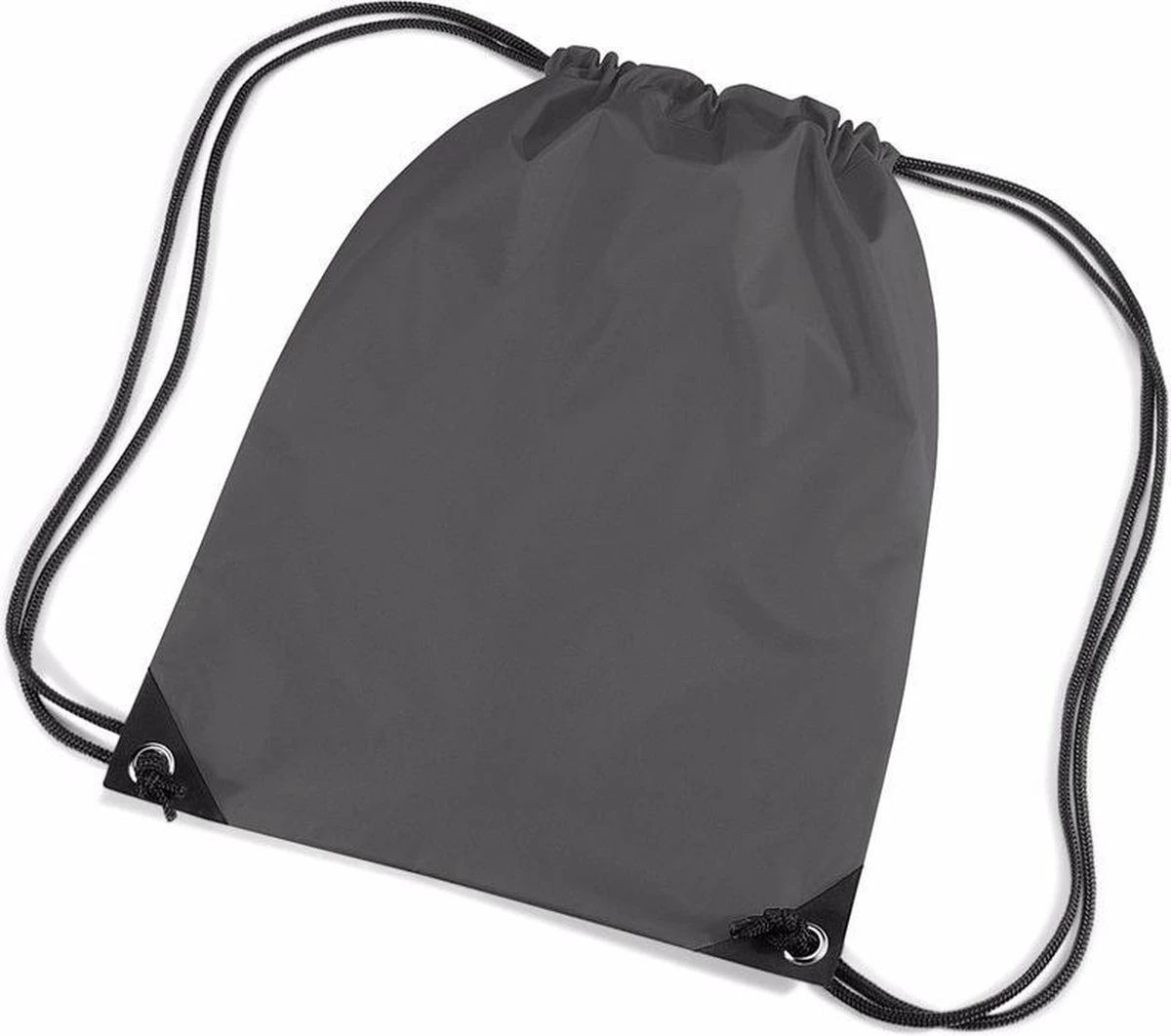 Nylon gymtas in het donkergrijs (antraciet) van waterafstotende stof en reigkoord. Inhoud: 12 liter. Afmeting: 45 x 34 cm.