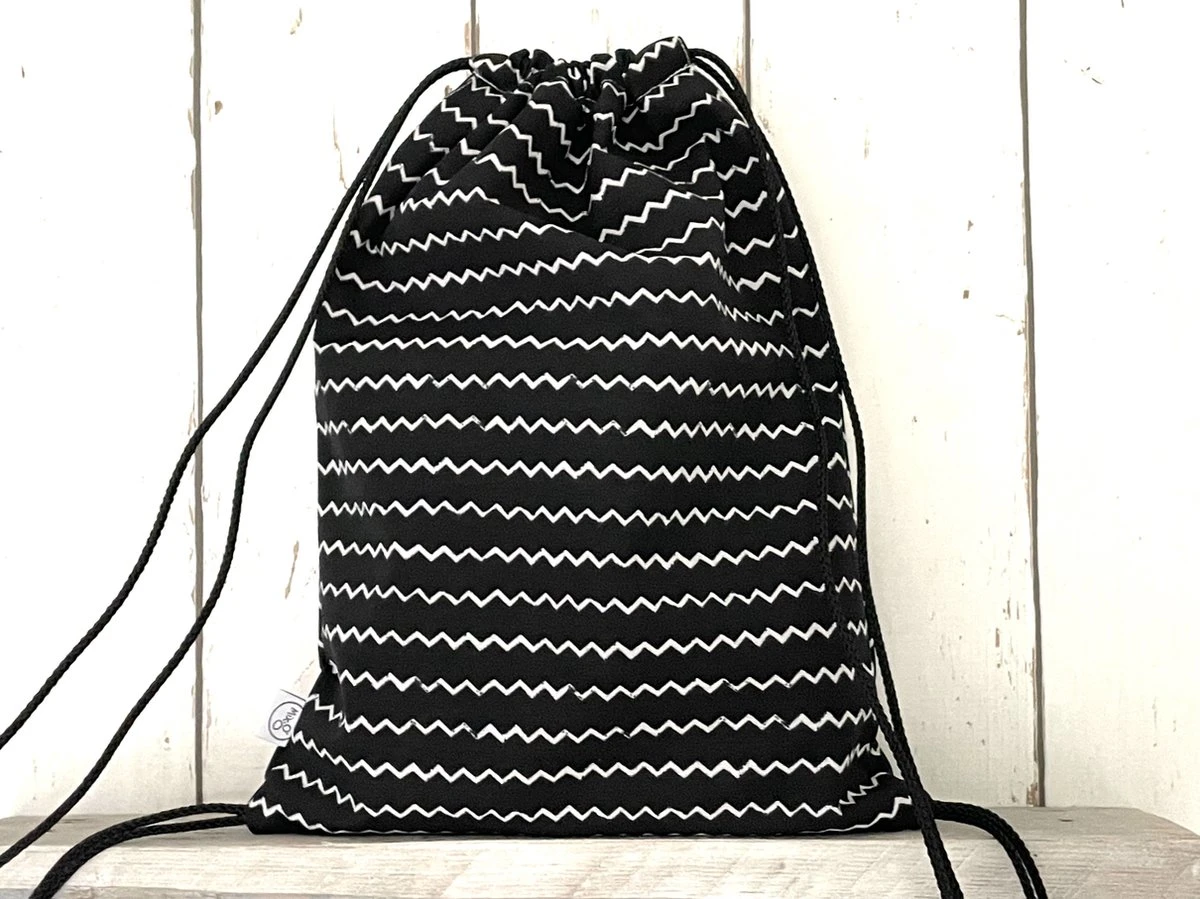 Stoer zwart/wit rugtasje voor jongens en meisjes. Dit tasje met rijgkoord is ideaal om te gebruiken als gymtas of zwemtas.