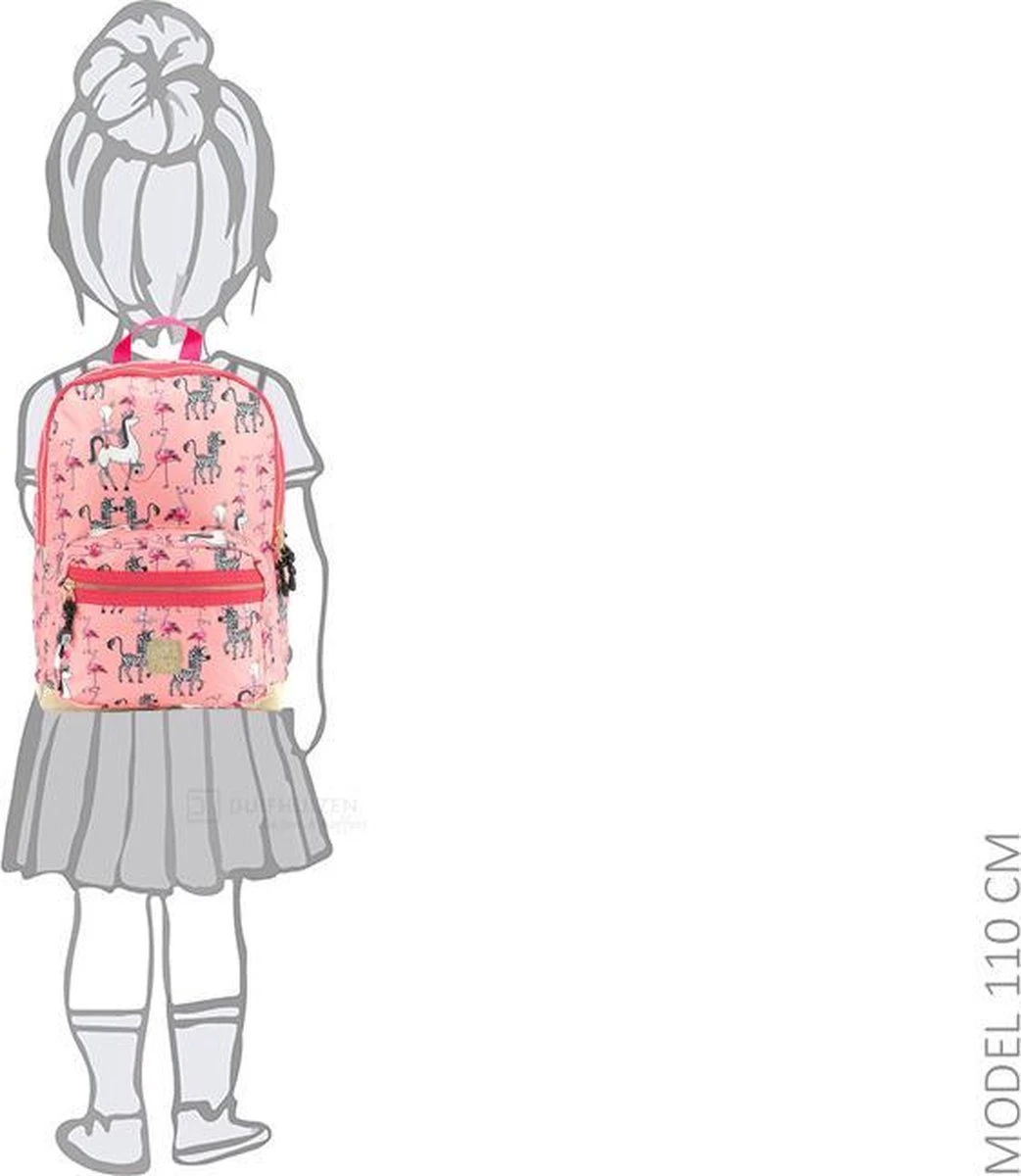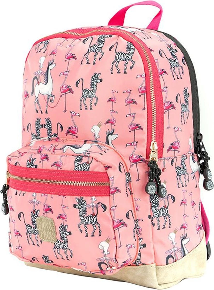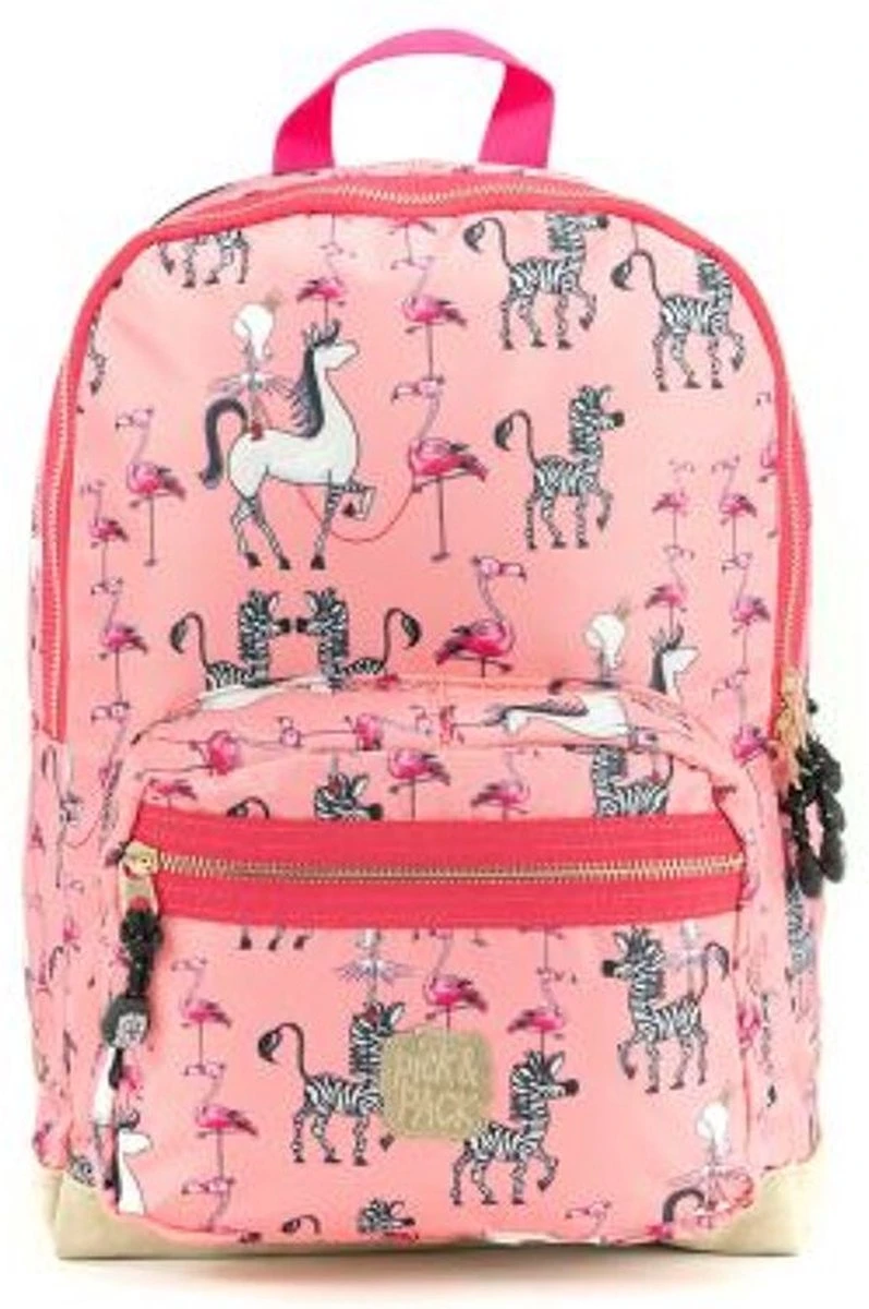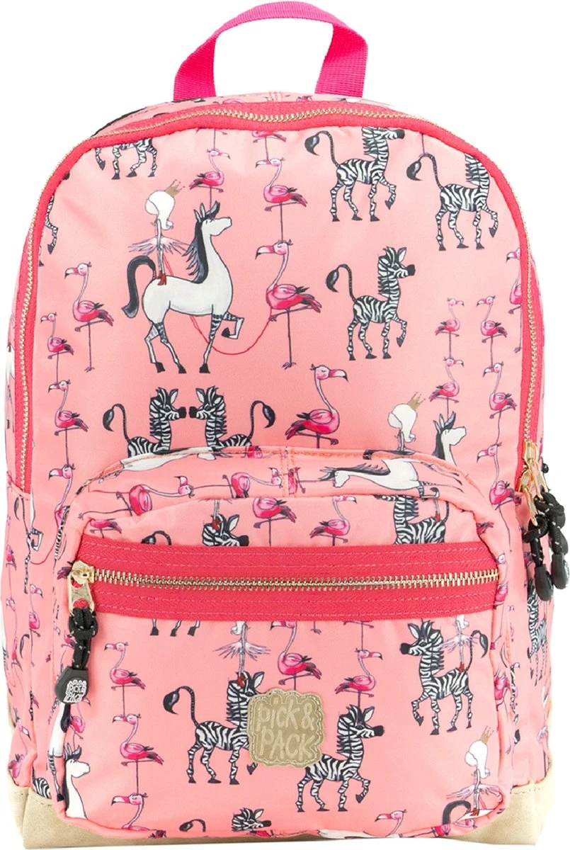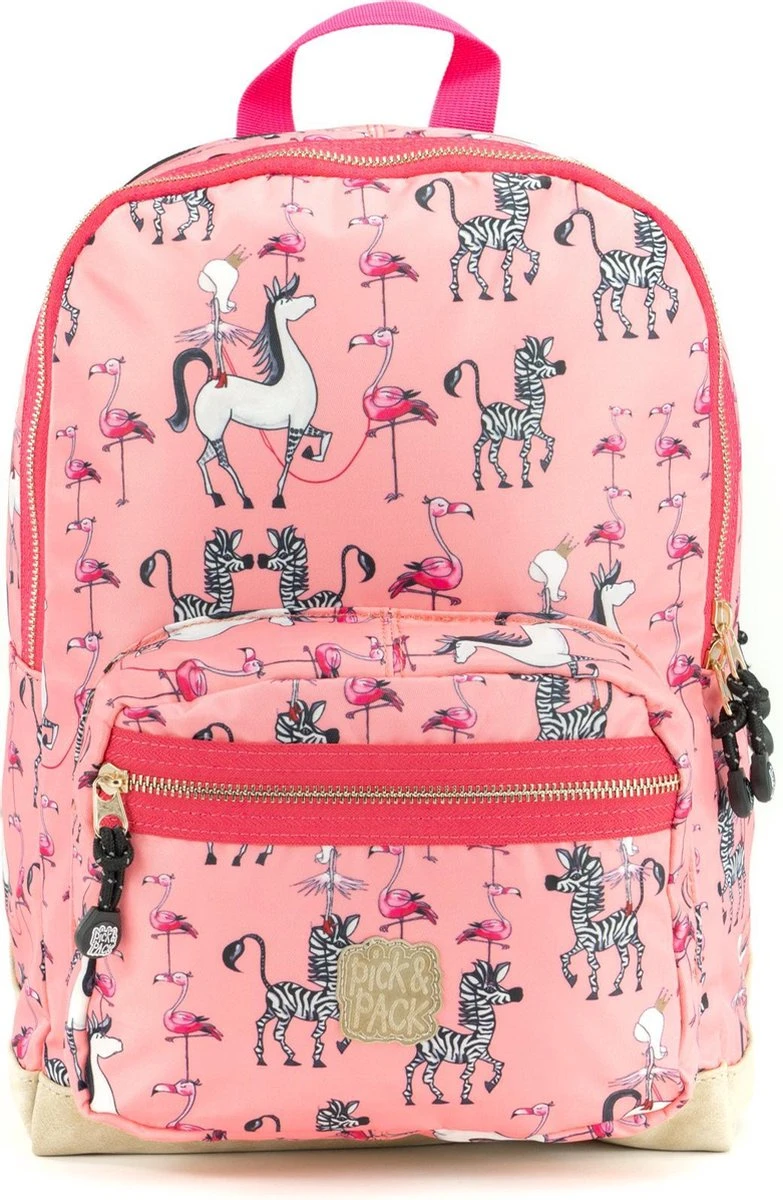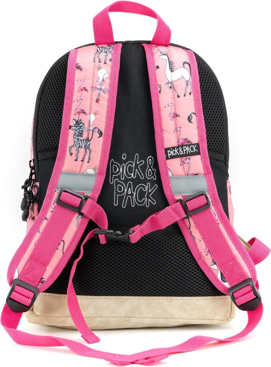 Pick & Pack Rugzak in een fantastische roze print met prinsessen, zebra’s en flamingo’s voor kinderen van 5 jaar en ouder. Dankzij het juiste formaat is de rugtas geschikt voor A4 formaat schoolspullen, een lunchbox en alle andere benodigdheden. Voorzien van een speciaal vak voor een drinkfles. Aan de binnenzijde zit een klein ritsvakje, vakje voor telefoon en een makkelijke sleutelhouder. Met daarop een adres label voor naam, adres en telefoonnummer. Makkelijk voor als de rugtas eens ergens wordt vergeten! Een apart gewatteerd vak is bereikbaar met een rits, hierin kunnen boeken of zelfs een 13inch laptop of ipad worden opgeborgen. Voorop een borstbandje om de rugzak stevig vast te maken tijdens het lopen. De rugtas is ook voorzien van kleine reflecterende details zodat je ook in het donker opvalt. Dankzij de gewatteerde schouderbanden en het ergonomische rugdeel is de tas goed door het kind zelf te dragen.