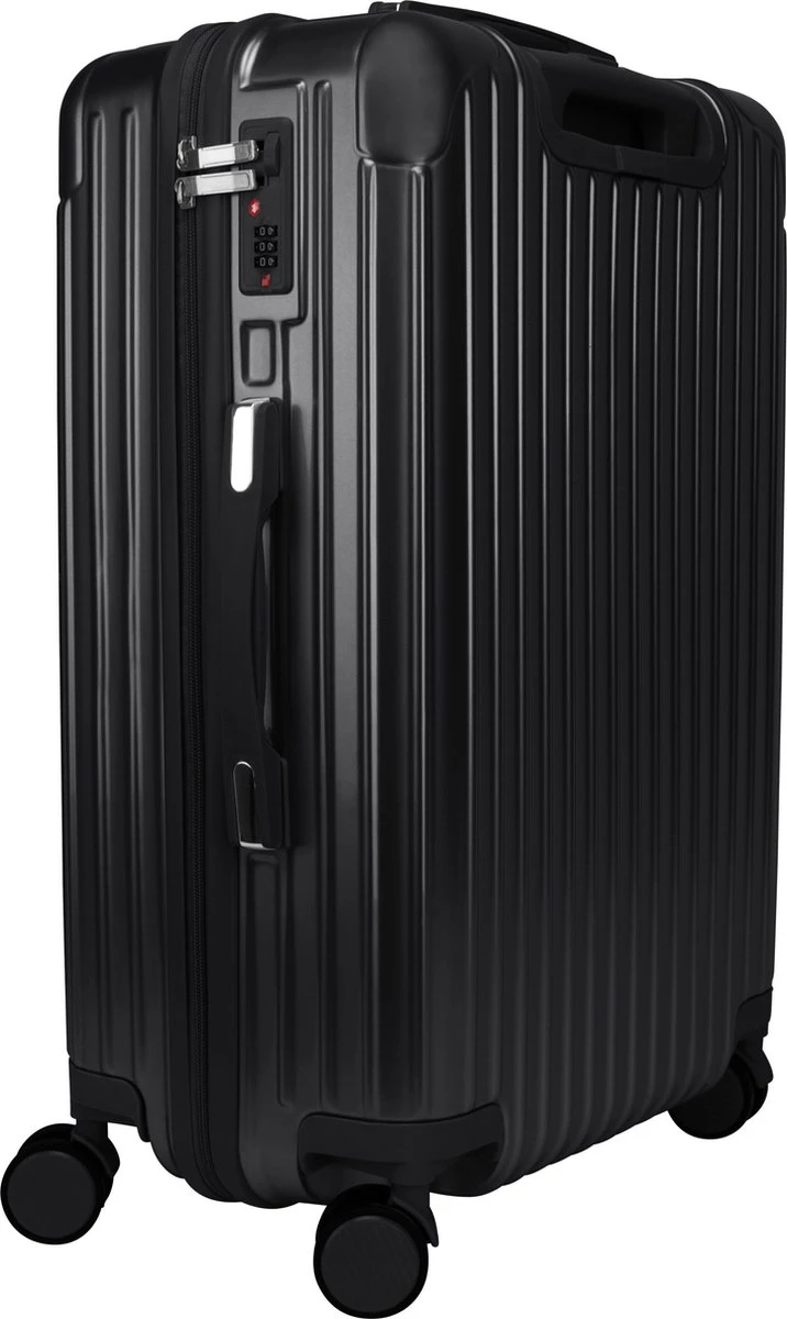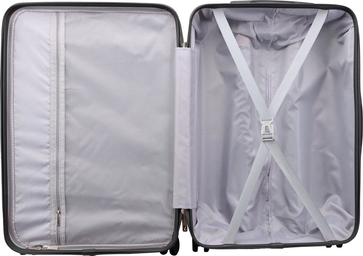 Deze betrouwbare koffer beschikt over al het nodigde voor u volgende vakantie. Een harde en veilige buitenkant, een aliminium trekstang, 3-cijferige slot, 4 dubbele flexibele wielen. De koffer is verkrijgbaar in 3 formaten. De middenmaat en grote maat zijn voorzien van stootrubbers, deze zorgen ervoor dat uw koffer tijdens transport zo min mogelijk beschadigd raakt. De stootrubbers bevinden zijn aan de lange zijde van de koffer. Zo beschikken de middenmaat en de grote maat ook voor een extra handvat. Deze zit onder het cijferslot. Doormiddel van deze extra handvat is het makkelijker om de zware koffer te verplaatsen of op te tillen in de auto, trein of bus. Binnen in de koffer is er een duidelijke en overzichtelijke verdeling. Aan de ene zijde een divider met 2 gekruiste spanbanden en aan de andere zijde een handige ritsvak. Dit maakt deze koffer van het merk Royal Swiss een betrouwbare reispartner met een fraaie design.
