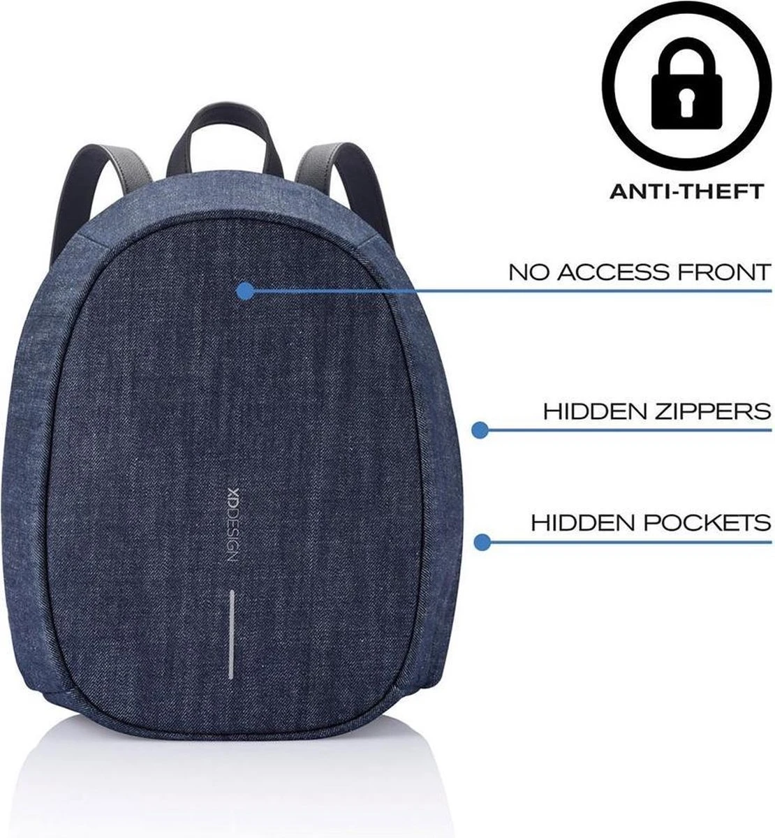 XD Design Bobby Elle Anti-diefstal Rugzak Denim Blauw, deze blauwe rugzak heeft een fraai design en is gemaakt van hoogwaardig polyester. Dit materiaal is snijvast, waardoor dieven de tas moeilijk kunnen opensnijden. Ook is het materiaal waterafstotend. De anti-diefstal rugtas heeft voor je veiligheid in het donker meerdere reflecterende details. Deze XD Design Bobby Elle rugzak is comfortabel op de rug te dragen door de verstelbare en gewatteerde schouderbanden, door het stevige handvat is de tas ook makkelijk op te pakken of in de hand te dragen.Aan de buitenkant heeft deze XD Design rugtas diverse verborgen vakjes, door de verborgen ritsen en compartimenten zijn je spullen altijd veilig opgeborgen en niet bereikbaar voor dieven en zakkenrollers. Het hoofdcompartiment is afsluitbaar met een stevige verborgen ritssluiting, door de wijde opening is dit ruime vak makkelijk toegankelijk. Binnenin heeft deze rugzak een beschermend tablet vak geschikt voor maximaal 9,7 inch tablets. Aan de binnenzijde zitten meerdere vakken en organizers voor het opbergen van kleine spulletjes. Wij zijn officiële XD Design dealer, dus u kunt natuurlijk rekenen op een volledige garantie.